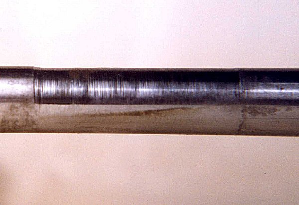 In this picture the rocker shaft has been turned over to show the wear which occurs on the underside.