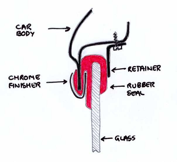 Now cut away the flap of rubber that would normally be between the glass and the back of the chrome finisher.
